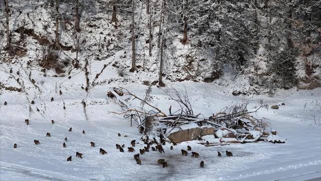金猴海(核心栖息地),入园乘坐观光车直达,沿途就能看到成群藏酋猴在雪地觅食、嬉戏,温顺亲人,不怯生但需保持适当距离。
